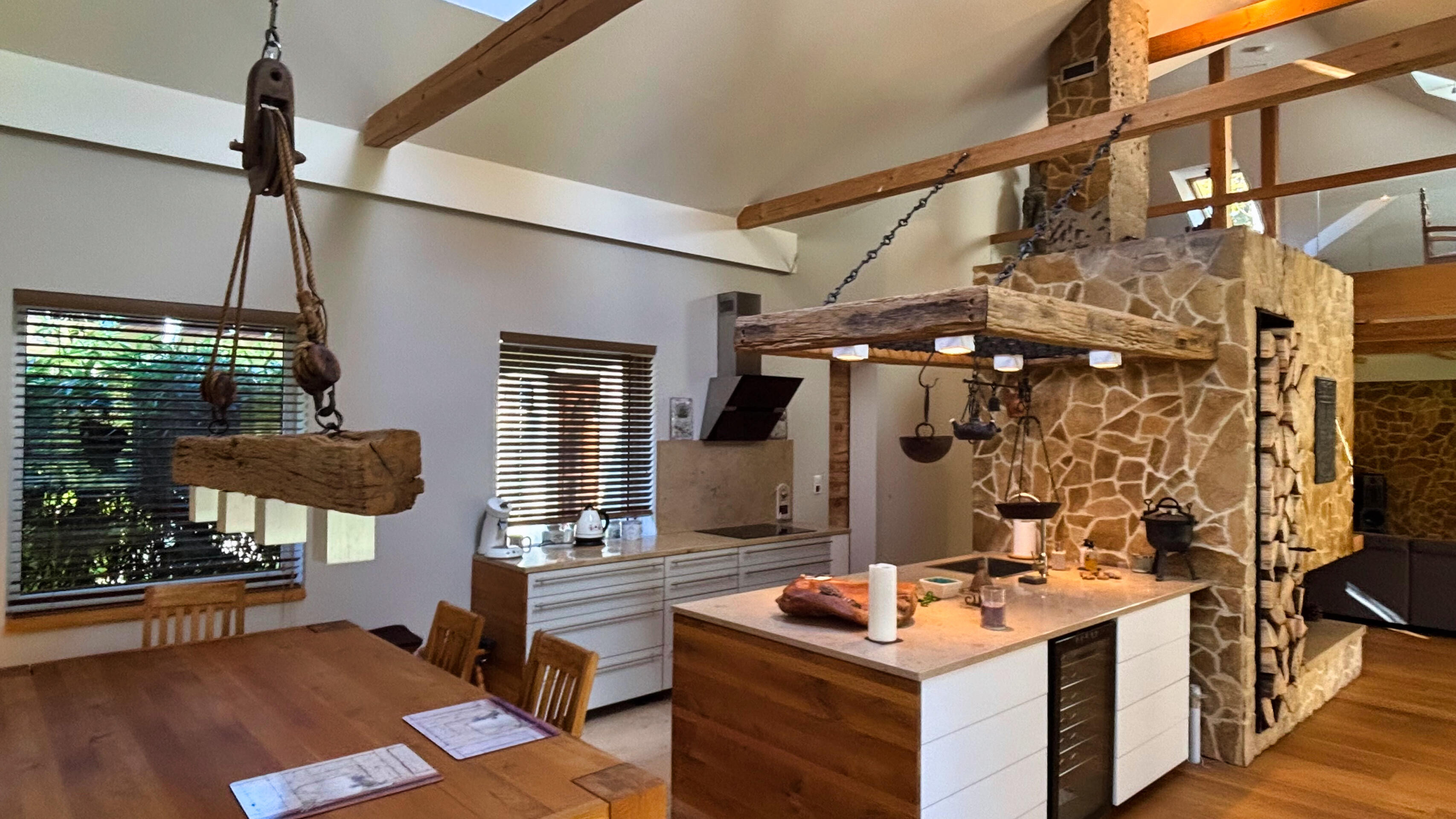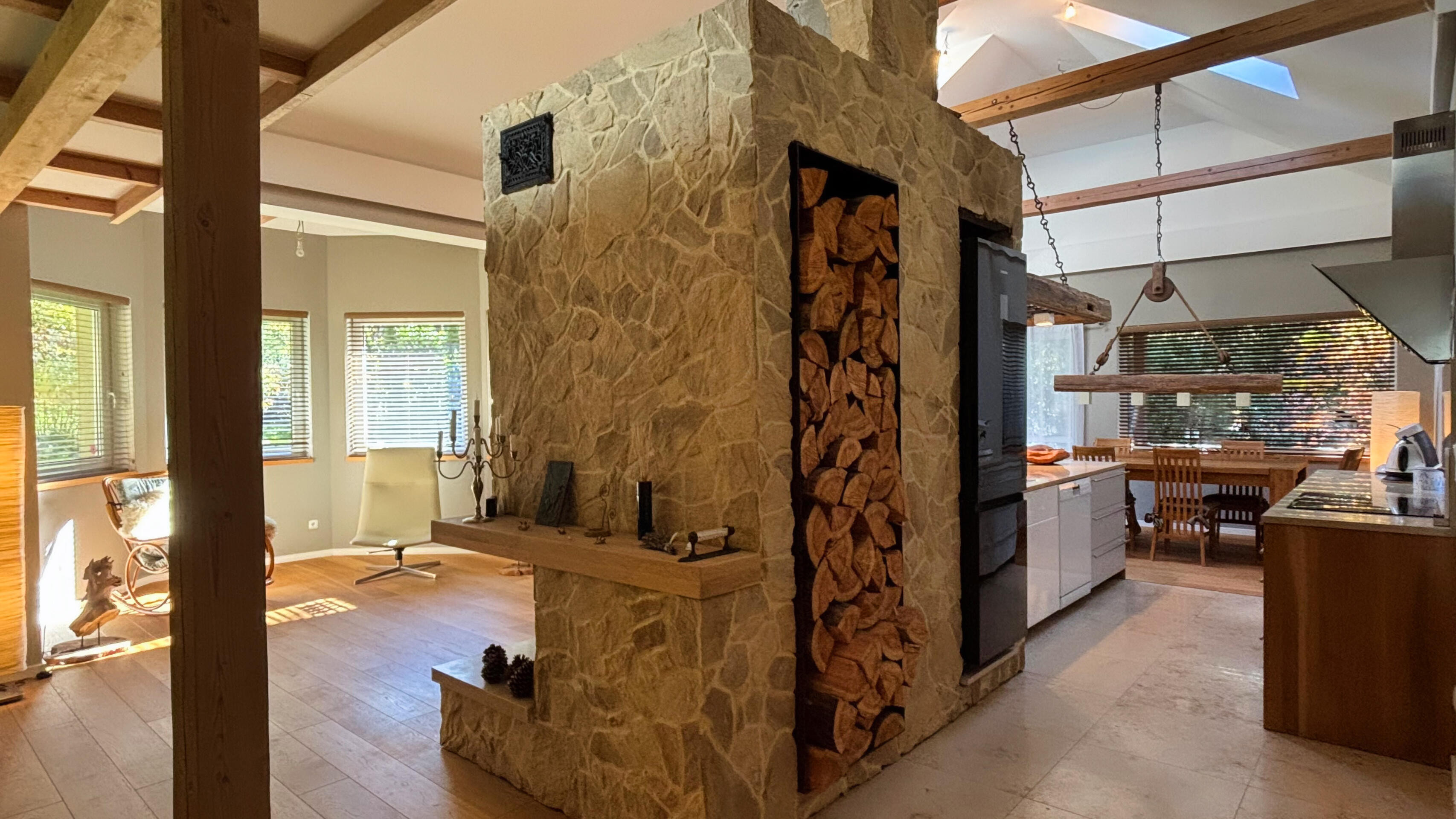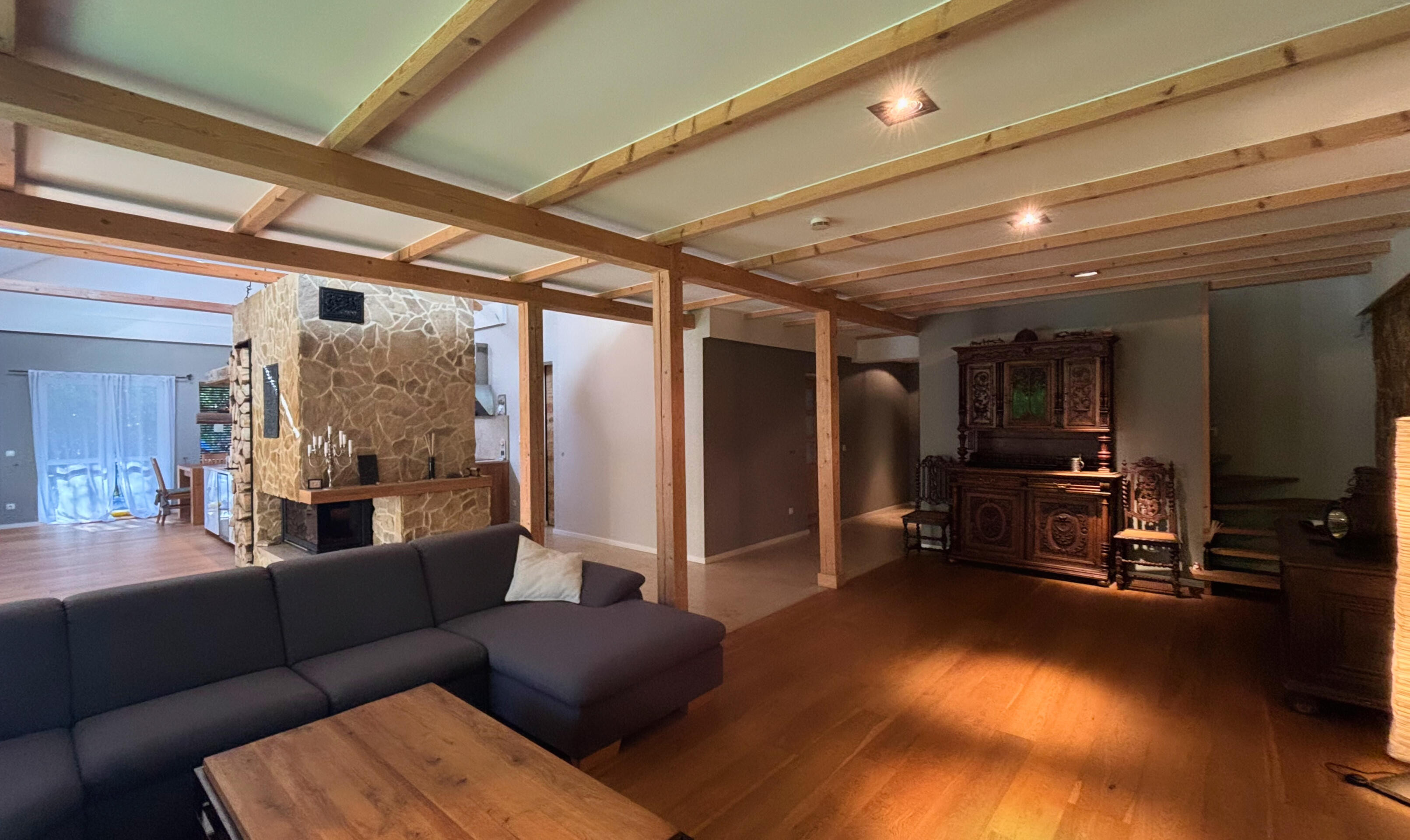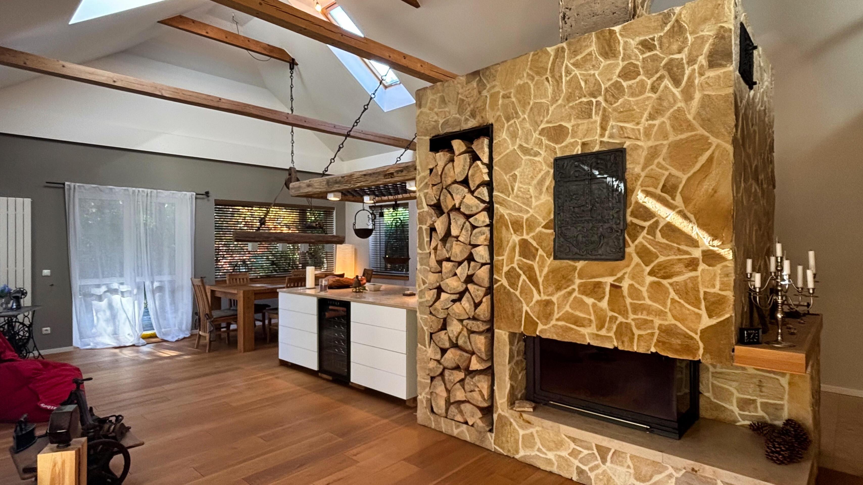1) przestronny salon z kominkiem i wyjściem na taras,