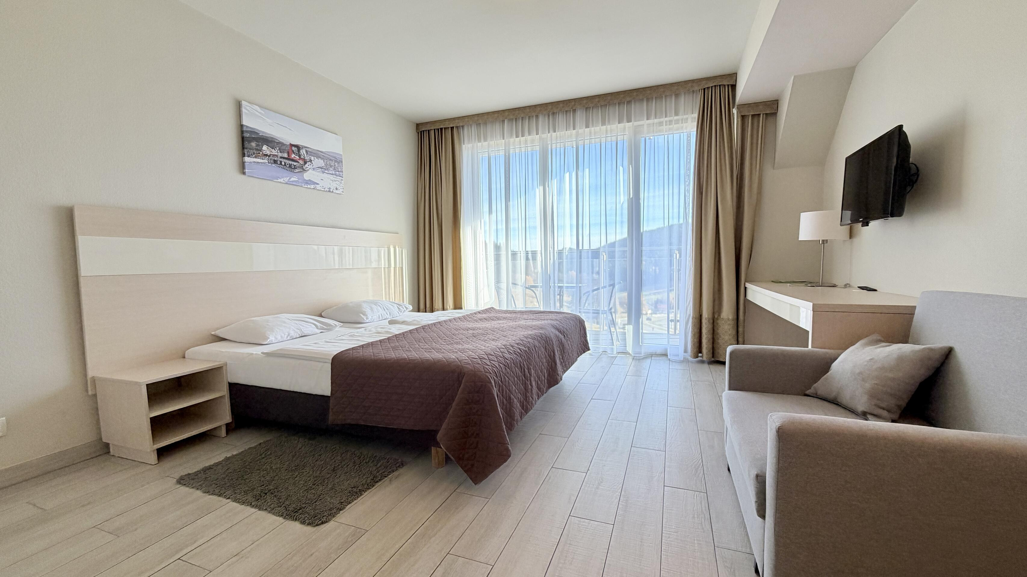 Z pokoju dziennego wyjście na balkon, z którego mamy widok na ośrodek narciarski.