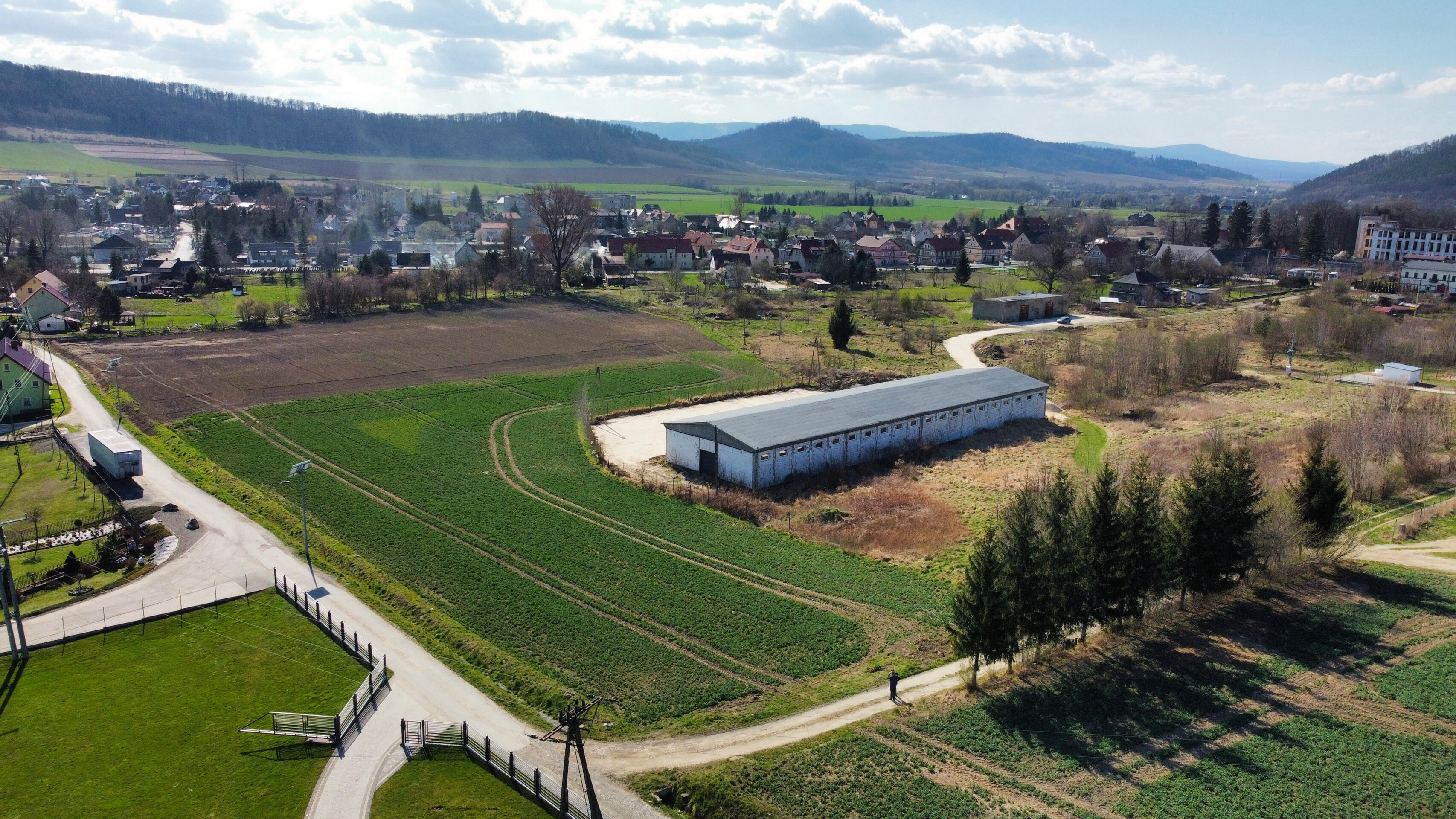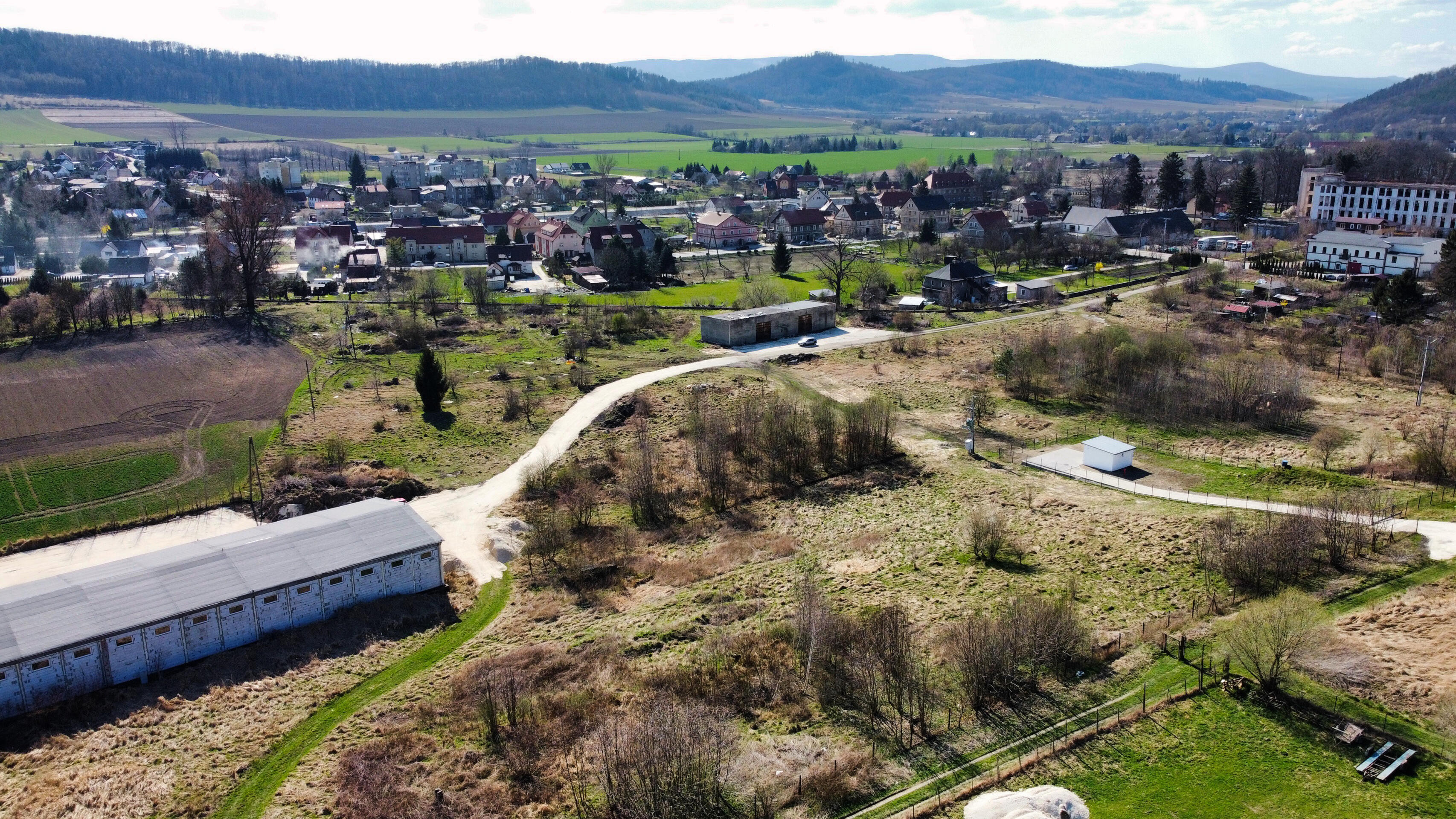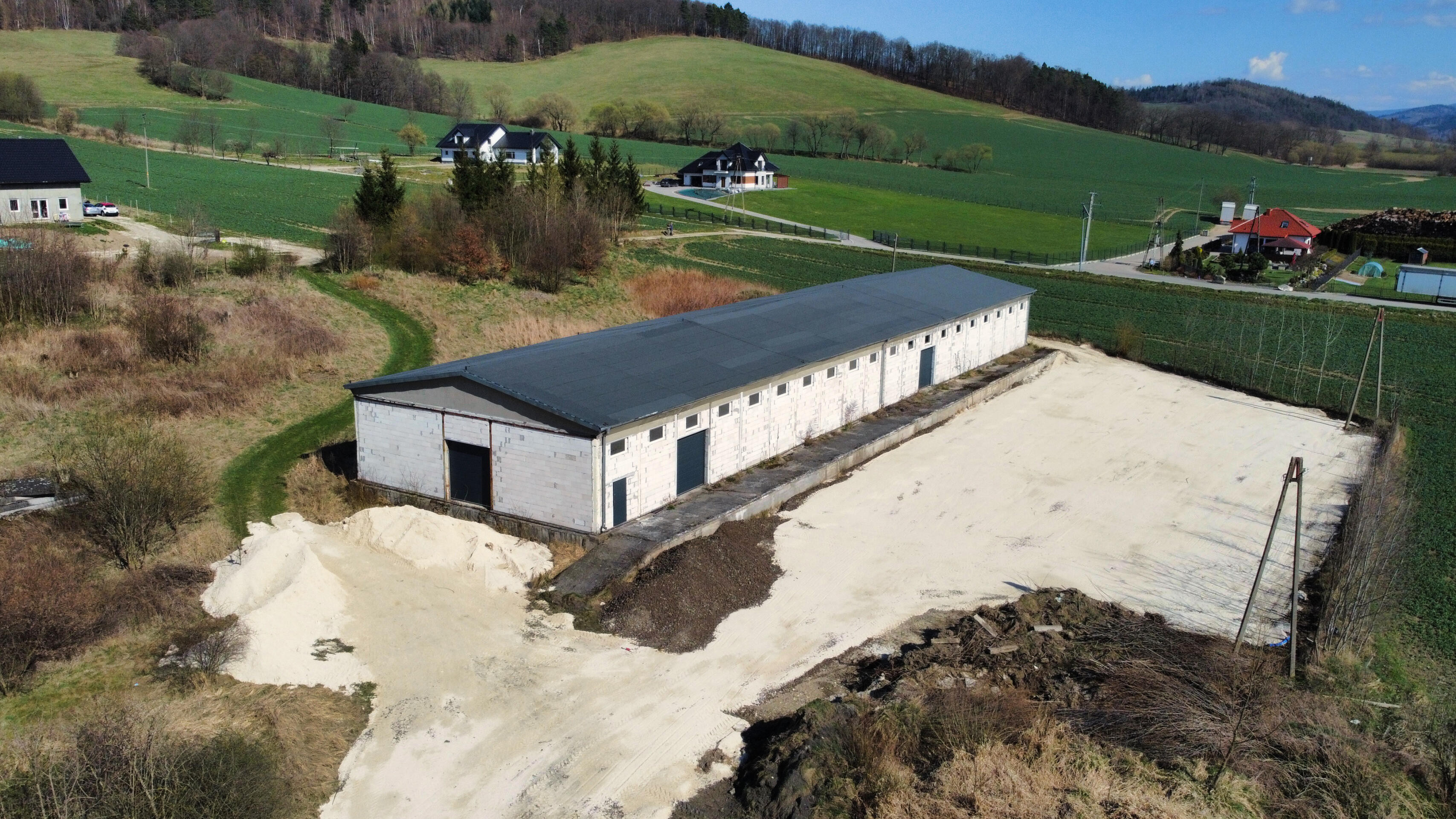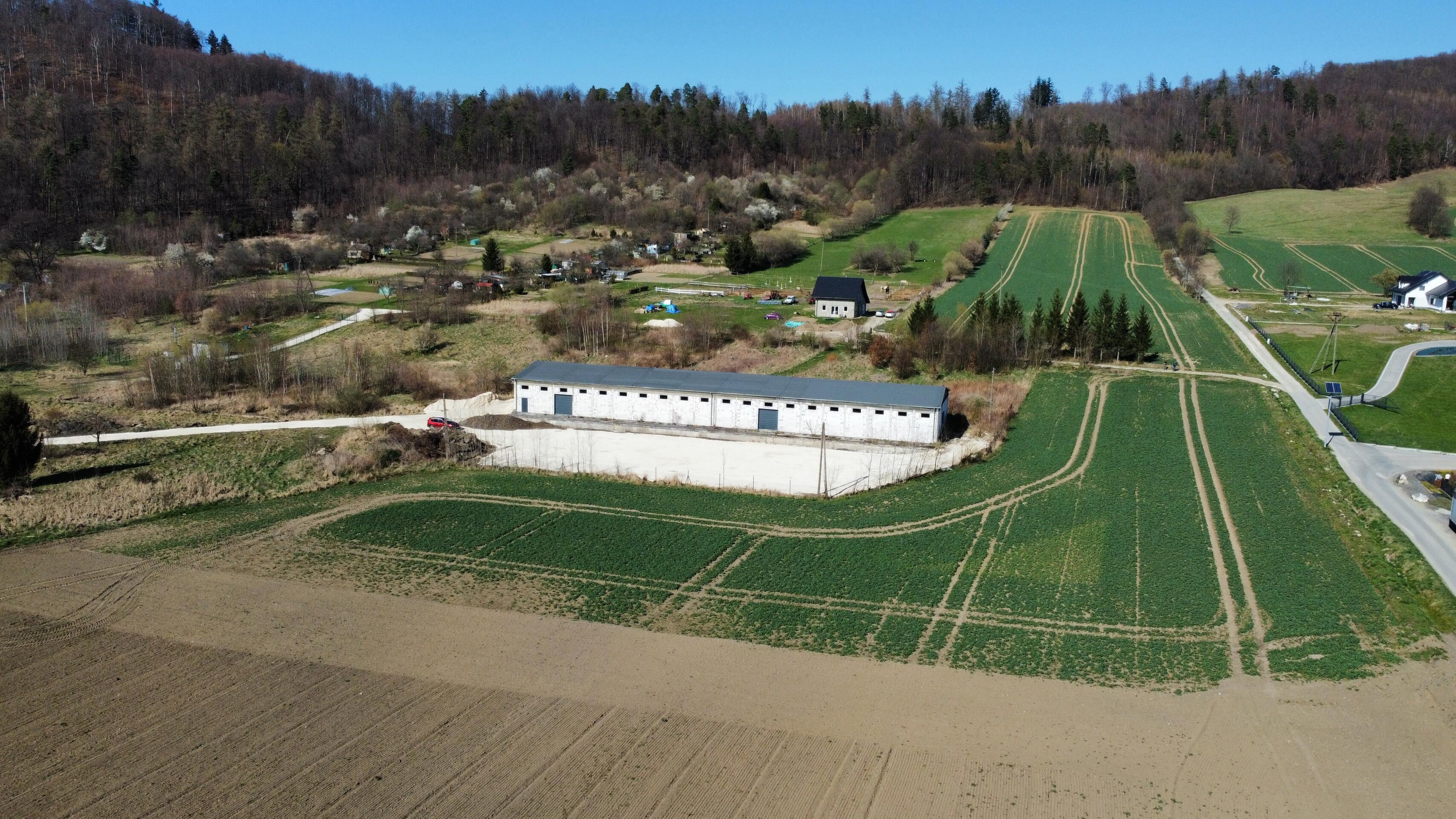 Hala dodatkowa (260 m²). Stan: W 2025 r. wykonano nowe pokrycia dachowe;budynki wymagają jedynie drobnych poprawek wykończeniowych. Media: Własny transformator o mocy 250 kW (z możliwością zwiększenia mocy) oraz przyłącze. Kompleks produkcyjno-magazynowy z potencjałem deweloperskim.